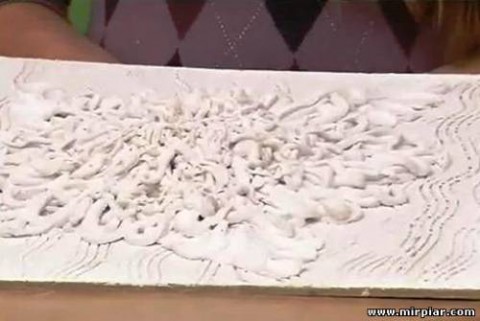 На основу шпателем нанесем тонкий слой смеси. При помощи вилки или расчески делаем фантазийный фон.