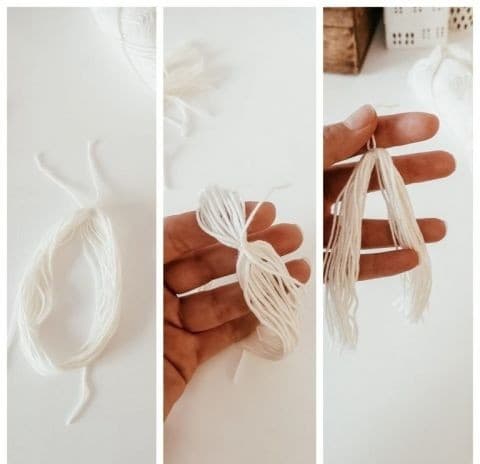 Снимаем по одной штуке с картона и аккуратно перевязываем посередине нашего будущего декора для абажура. Сворачиваем в две части, чтобы создать красивую вещь.