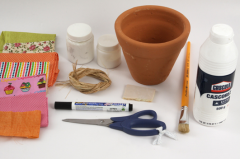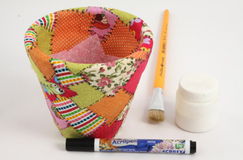 Ткань, наклеенную на горшок сверху покрываем клеем. Маркером наносим черточки и крестики, имитируя пэчворк.