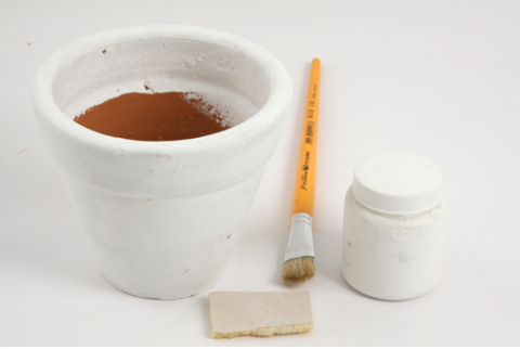 Изначально окрашиваем наш цветочный горшок в белый цвет. Внутреннюю поверхность полностью окрашивать не обязательно, достаточно окрасить сантиметров пять.
