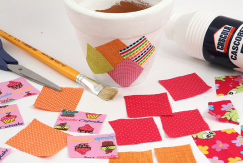 Приготовленную ткань нарезаем на небольшие квадратики, и приклеиваем к горшку в произвольном порядке.