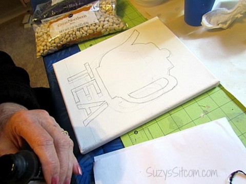 Выкладываем фасолью чайник, старайтесь не испачкать клеем сам холст ориентируясь только на основной рисунок. Если под чайником есть надписи, то выкладываем и их тоже.