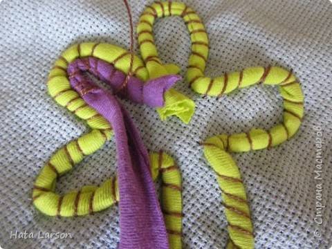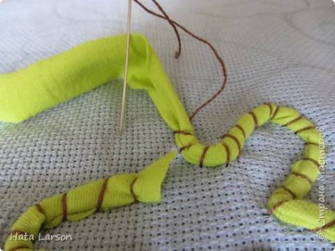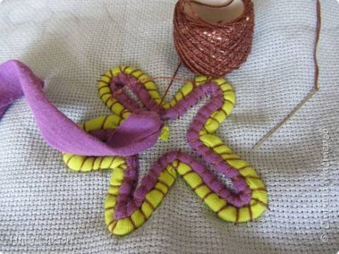 И начала пришивать толстыми нитками ленты, сворачивая их в трубочку.