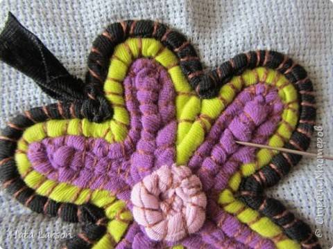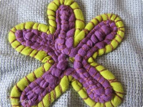 Еще одна идея утилизации старых футболок — вышивка трикотажными лентами. Это очень интересная техника, освоив которую, можно обзавестись ковриком, подушкой, накидкой на диван или кресло, сумкой — все зависит только от вашей фантазии и количества старых футболок.