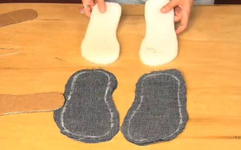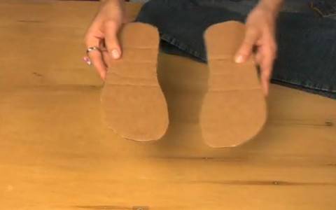- Возьмем лист поролона и вырежем две удобные подошвы для будущих тапочек из джинсов.