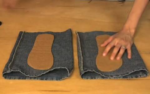 - Из вороха ненужных джинсов потребуется выбрать те, в карманы которых легко размещаются ваши ноги. Ступни должны легко входить и выходить из карманов, чтобы в дальнейшем тапочки были впору.