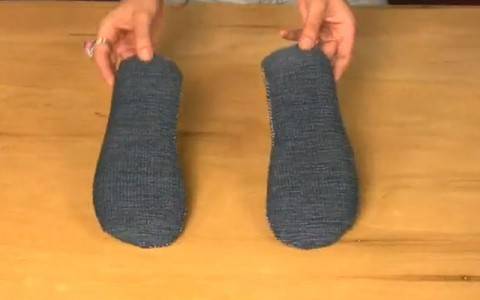 - Следующим этапом будет – выворачивание заготовки тапочек на лицевую сторону. После чего в нее нужно поставить подошвы: картон, а поверх него поролон. Не перепутайте, так как лучше иметь под ступней удобную подошву из поролона.